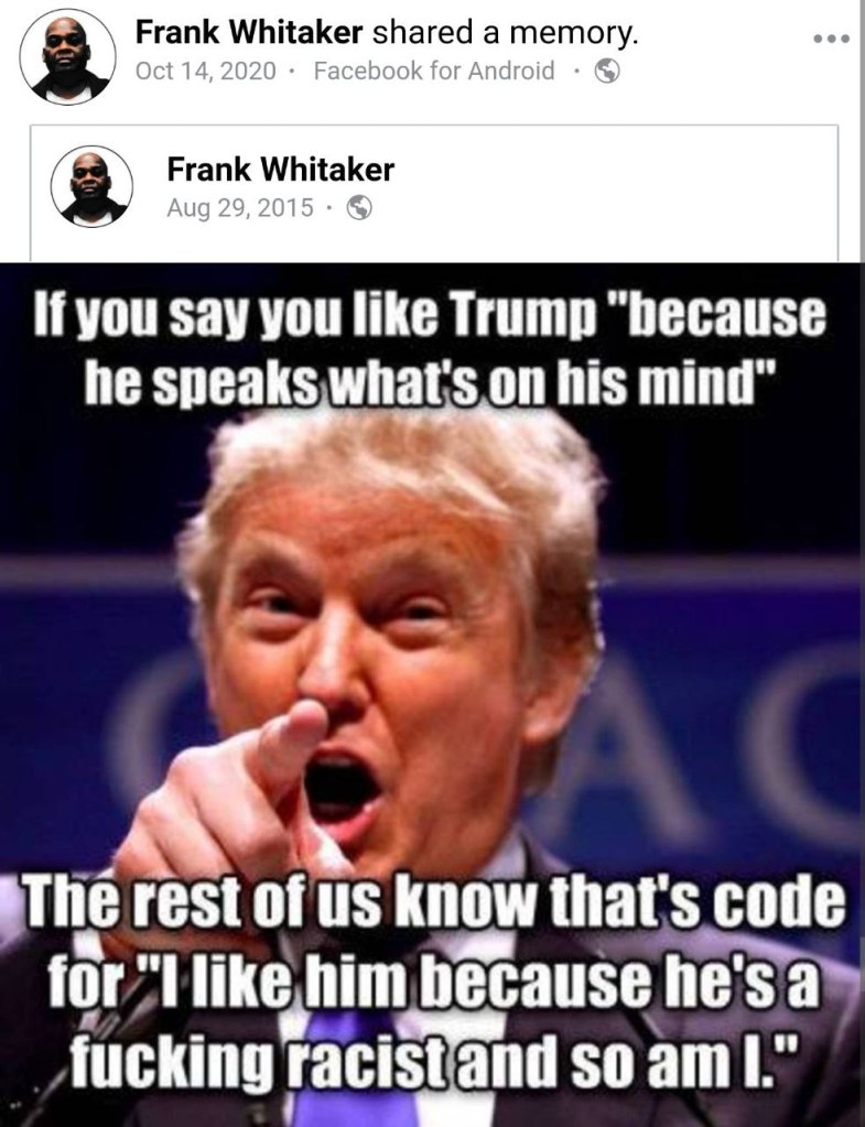 His social media posts include many pro-Marxist Black Lives Matter propaganda items, as well as that attempted to infer anyone who supports Donald Trump is a racist.