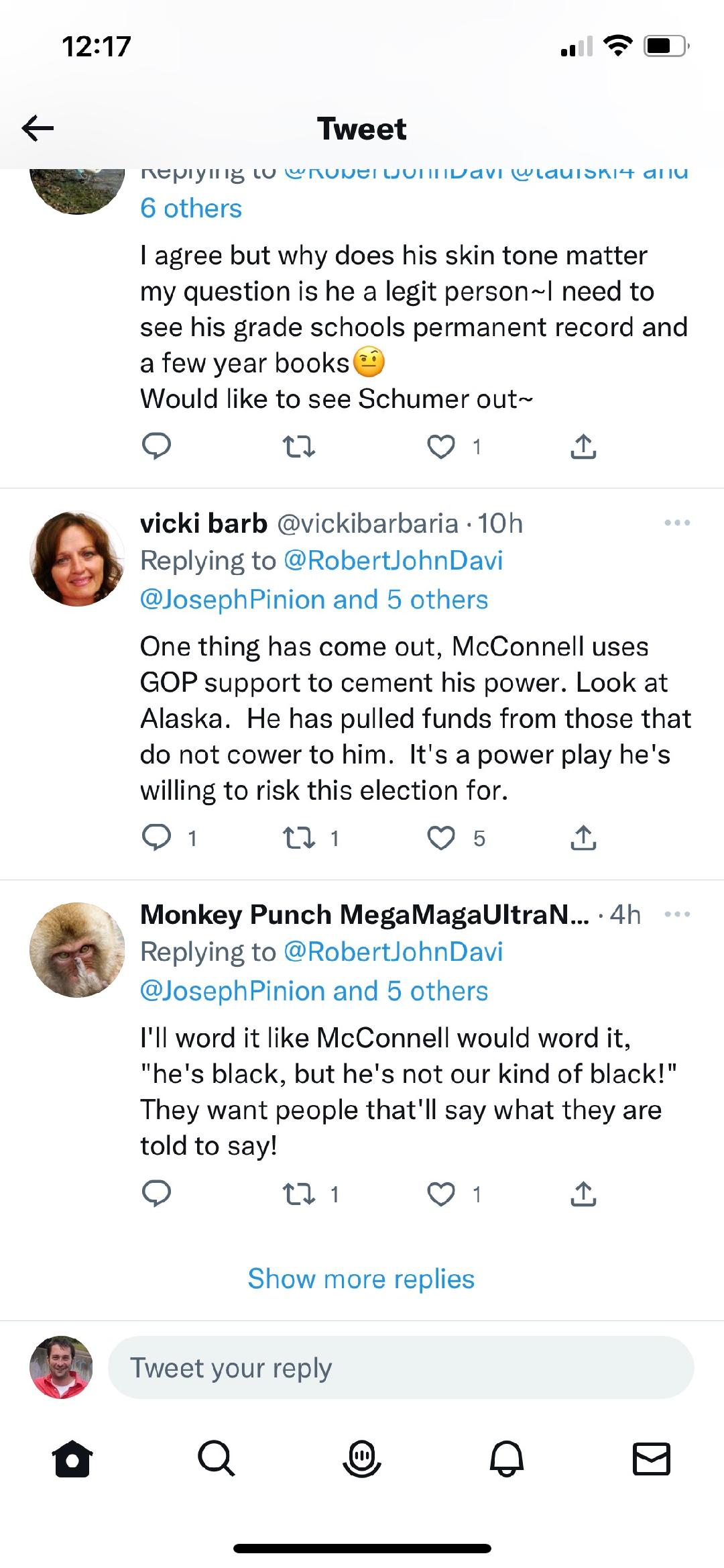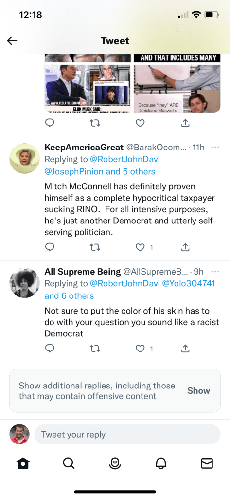 The image on the left shows a typical Twitter thread with a lot of interaction. The “Show more replies” link is at the bottom. On the other image, you can see once clicked, we now have access to lots more replies, most of them against the narrative of political correctness.