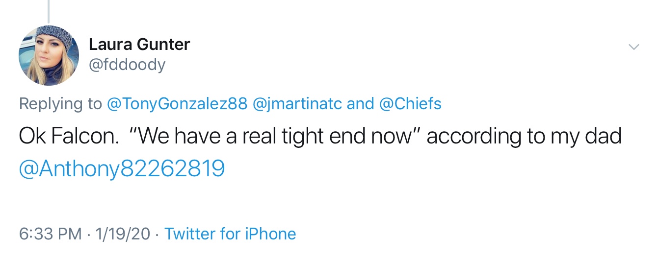 Former Kansas City Chiefs tight end Tony Gonzalez took to Twitter on Sunday evening following the Chiefs 35-24 win over the Tennessee Titans in the AFC Championship Game at Arrowhead Stadium.